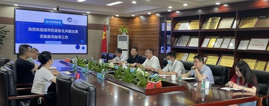 6月7日,成都市成華區(qū)政協(xié)副主席文兵帶隊蒞臨四川招港建設有限公司開展調研指導工作,公司總經理包中輝、總經理助理王雨欣及副總工程師鄧正洪熱情接待并參與座談。