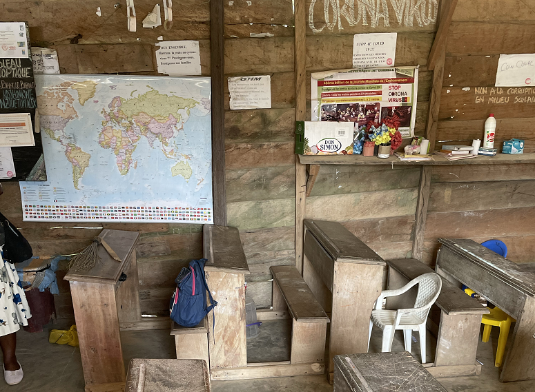 招港國際公司喀麥隆石場項(xiàng)目地處偏遠(yuǎn)山區(qū),林多地少,環(huán)境惡劣,條件艱苦。Eboundja小學(xué)位于項(xiàng)目部駐地附近,學(xué)校由村民自建,校舍用木板搭建,校內(nèi)只有一名校長和一位老師,學(xué)校的日常開支大多也由周邊村民自發(fā)捐助。