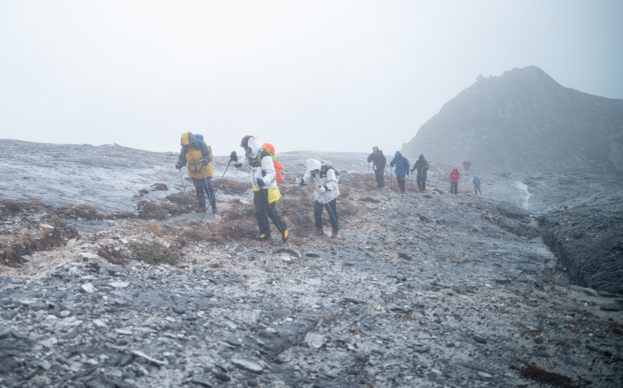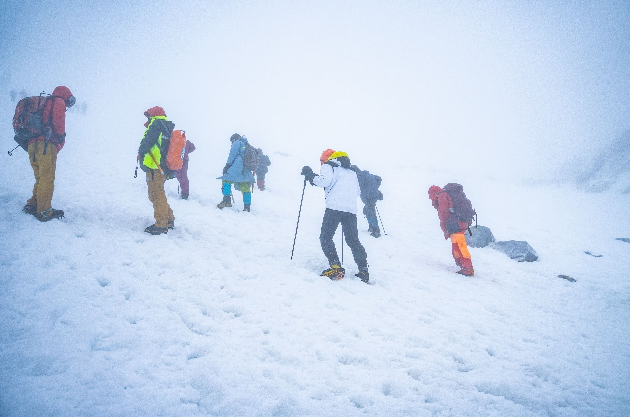 10月8日凌晨四點(diǎn),登山隊(duì)沖頂,在大風(fēng)迷霧濕冷的極為惡劣天氣的情況下,6名隊(duì)員(周善戰(zhàn)、黃曉然、李治飛、李曉軒、林國(guó)才、張柏松)攀登至海拔5396米峰頂,3名隊(duì)員(羅雷、王波、許可愛(ài))攀登至5100米海拔處,1名隊(duì)員(唐萌萌)攀登至4600米海拔處。