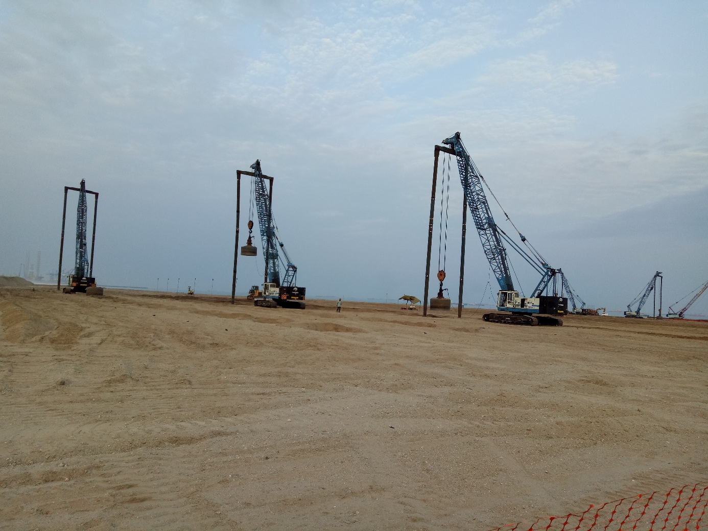 加納特碼新集裝箱碼頭工程項(xiàng)目(一期工程)位于西非加納特碼市,與首都阿克拉相距約26公里。工程包括3個(gè)15萬(wàn)噸集裝箱碼頭泊位,總長(zhǎng)1000米。防波堤總長(zhǎng)3558米、東西護(hù)岸總長(zhǎng)1000米、堆場(chǎng)98萬(wàn)平方米、吹填方量總計(jì)約884萬(wàn)方、港池及航道疏浚725萬(wàn)方。港灣工程公司作為參建分包商,主要負(fù)責(zé)該項(xiàng)目地基處理專項(xiàng)工程,項(xiàng)目于2017年3月開(kāi)工,2019年8月完工。