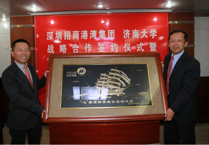 簽約儀式后,雙方舉行了“心?港灣”慈善助學(xué)基金捐贈(zèng)暨啟動(dòng)儀式。校黨委書記、濟(jì)南大學(xué)教育發(fā)展基金會(huì)理事長范躍進(jìn)代表學(xué)校接受了深圳市招商港灣集團(tuán)有限公司捐贈(zèng)的100萬元的慈善助學(xué)基金及紀(jì)念品。深圳招商港灣集團(tuán)副總裁徐健詳細(xì)介紹了“心?港灣”慈善助學(xué)基金設(shè)立的初衷和運(yùn)作模式。