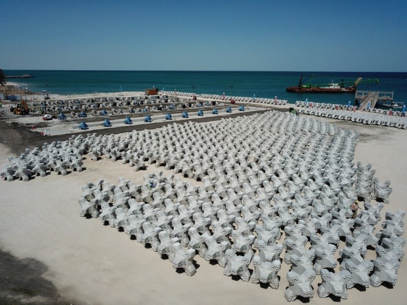 上午9時45分,贠總一行抵達公司科威特國家衛(wèi)隊游艇碼頭項目混凝土方塊預(yù)制現(xiàn)場,公司項目管理班子成員給予了熱情接待。贠總饒有興致地視察了預(yù)制場,并仔細詢問了方塊預(yù)制的進展情況。隨后,大家到達扭王塊預(yù)制場和海上施工現(xiàn)場。扭王塊預(yù)制場是在絞吸疏浚沉降池的基礎(chǔ)上平整形成的,現(xiàn)已存放扭王塊1074塊,每天新增30塊。