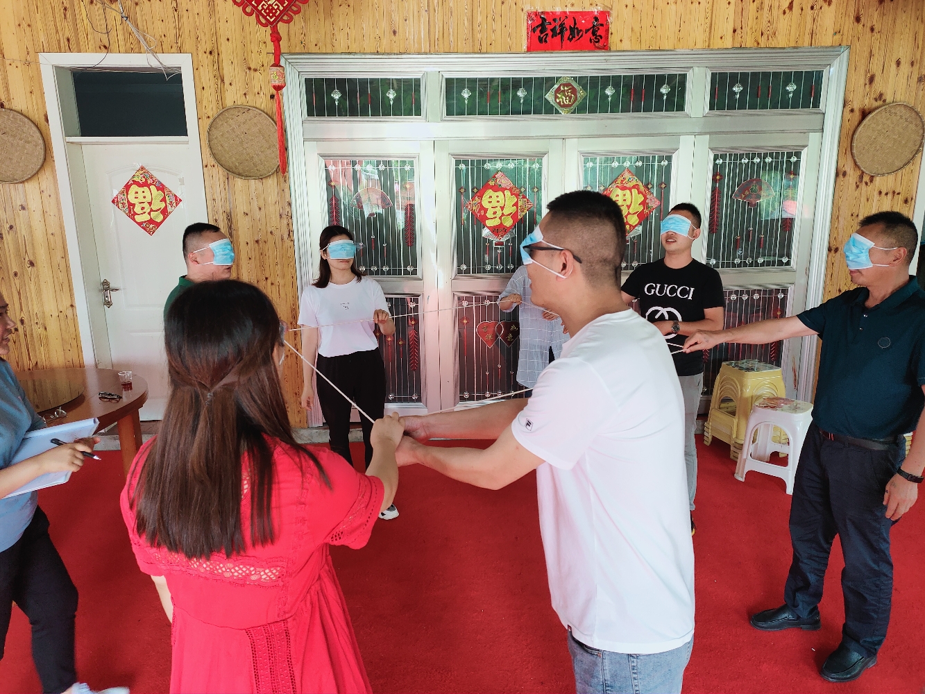 “攜腿共進”同協(xié)作,分組拓展見默契。徒步結(jié)束后的分組拓展訓練考驗大家的團隊協(xié)作、信任、默契、溝通。熱身游戲丟手絹帶領(lǐng)大家回憶兒童時代,感受童真快樂;訓練項目盲人方陣中,經(jīng)過反復試驗摸索,大家在帶上眼罩的情況下,完成了正方形方陣、三角形方陣的任務;綁腿跑項目中,大家肩并肩“攜腿共進”,默契配合;你劃我猜項目中,負責比劃的隊員表演生動幽默,在引得大家開懷大笑的同時,也成功傳達了重要信息。最終,棉花組在訓練過程中表現(xiàn)出色,獲得了最終勝利和活動獎品。